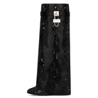 The Galora Boots are pure high-shine drama, built to steal every spotlight. Designed in a bold wedge silhouette, they’re drenched in allover crystal studs that catch the light from every angle. Finished with a sleek overlay panel and statement padlock hardware, they’re unapologetically luxe.