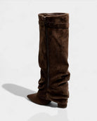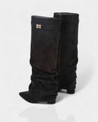 The Shark Lock Boots blend sleek design with a plush faux suede and leather finish for an effortlessly elevated look. Featuring a sharp pointed toe and knee-high cut, they’re accented with a slim strap and metallic buckle for a refined edge. The sculpted high heel adds height while keeping the silhouette bold and modern.