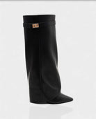 DETAILS & SIZING The Maisy Boots command attention with their sculpted silhouette and polished finish. Designed with a sharp pointed toe and sleek knee-high cut, these boots bring instant edge to any look. A slim strap with metallic buckle detail adds just the right touch of sophistication.